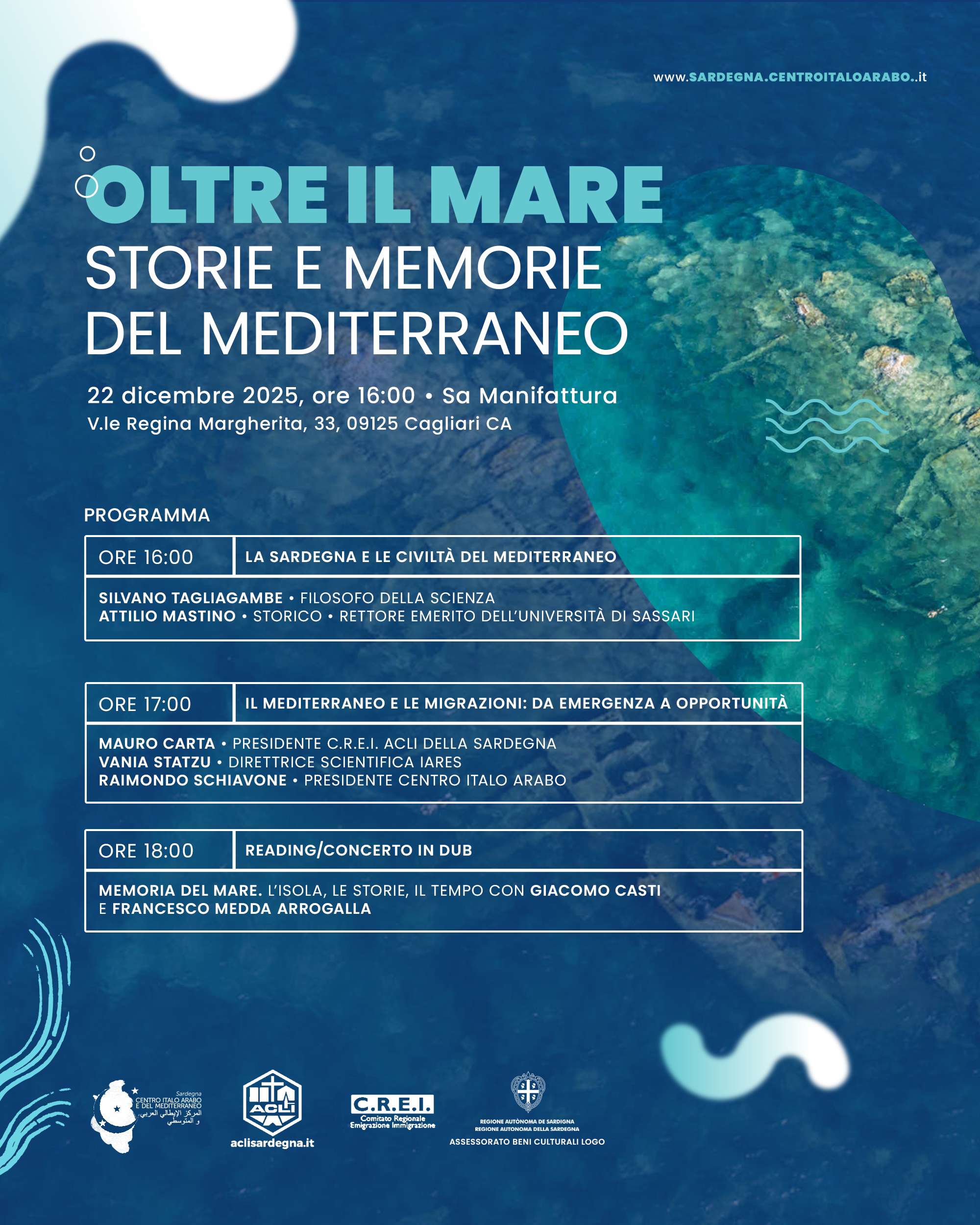 Il progetto "Oltre il Mare. Storie e memorie del Mediterraneo", promosso dal Centro Italo Arabo e del Mediterraneo, nasce con l'obiettivo di raccogliere e raccontare le memorie mediterranee, unendo passato e presente. Il Mediterraneo è sempre stato un crocevia vitale per popoli, culture e religioni, ma negli ultimi decenni ha anche visto trasformarsi in un luogo di conflitti e tragedie, con le migrazioni che segnano il suo scenario attuale. La Sardegna, posta al centro di queste rotte, è protagonista di questo progetto, che vuole valorizzare le storie di chi ha attraversato e continua ad attraversare questo mare, cercando di dare voce a chi non ha mai avuto la possibilità di raccontarsi.